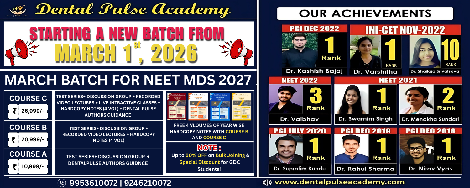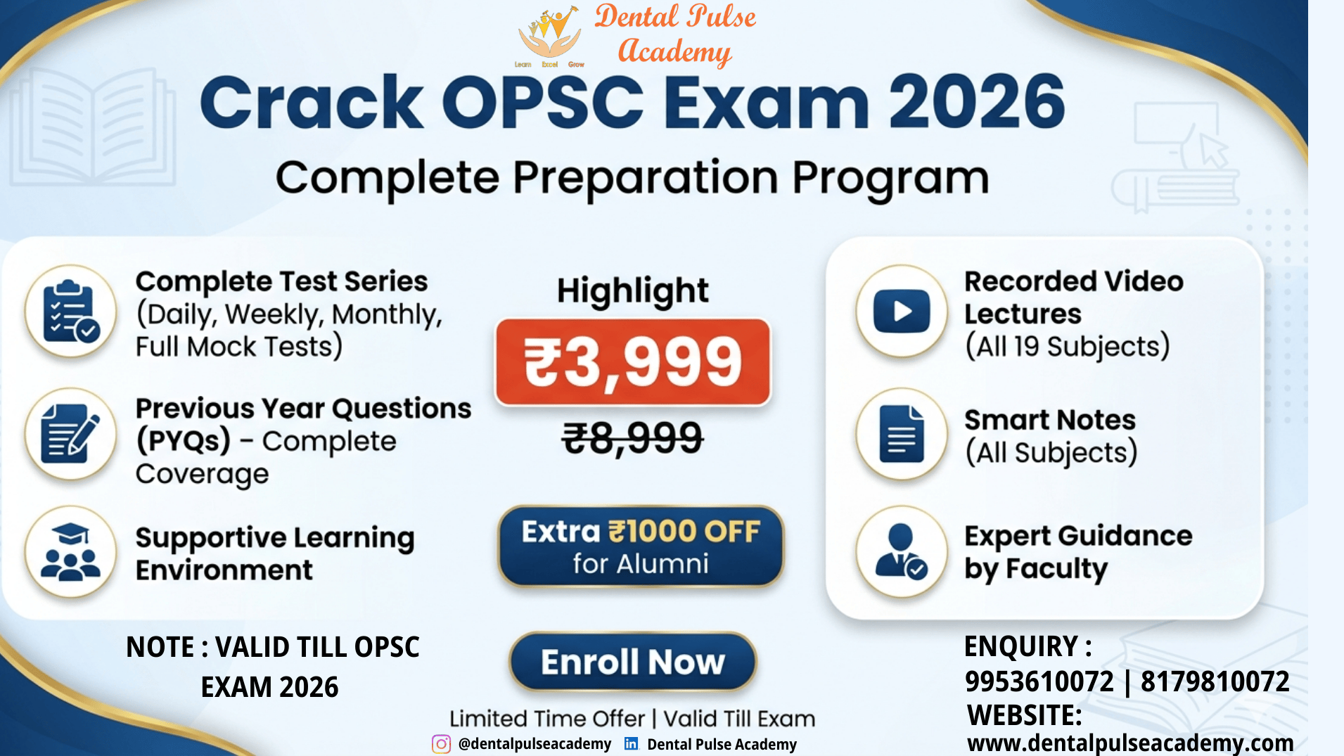 🗞️ UPPSC 2026 DENTAL SURGEON EXAM | 157 POSTS ANNOUNCED 🗞️ 🦷 UPPSC DENTAL SURGEON BATCH – DENTAL PULSE ACADEMY 🦷 🚨 Golden Opportunity for Dental Graduates! 📊 Total Vacancies: 157 Posts 🎯 What We Provide in the UPPSC Batch: ✅ Recorded Video Lectures of all 19 Subjects ✅ UPPSC PYQs – exam-oriented approach ✅ UPPSC Simulated Tests – Daily, Weekly & Grand Tests ✅ Smart Notes of all 19 Subjects (Concise & High-Yield) ✅ Dedicated Doubt Clearance Group ✅ Complete Guidance from Dental Pulse Authors 💰 Course Fee: ₹4,999 only 🎁 Special Benefit: Flat ₹1,000 OFF for Dental Pulse Academy Alumni 📌 Important Information: 🔹 Fees once paid are strictly non-refundable 🔹 Course validity will be till the UPPSC Dental Surgeon Examination 📌 Learn smart | Practice daily | Crack UPPSC confidently 📲 Enroll Now 🌐 www.dentalpulseacademy.com 📞 9953610072 ✨ Secure your UPPSC Dental Surgeon dream with Dental Pulse Academy!